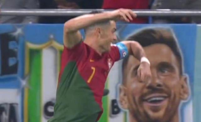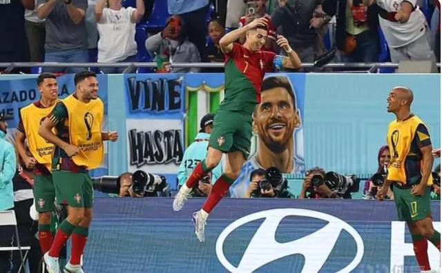 对加纳一战进行到第65分钟,C罗制造并罚进点球,为葡萄牙队首开纪录。凭借那粒点球,他成为历史上第一位5届世界杯进球的进球。好巧不巧,C罗跑到场边,跳起来以招牌动作庆功时,场边电子广告牌正好换到梅西代言的一个广告。C罗第五届世界杯进球,梅西成了他的背景板。